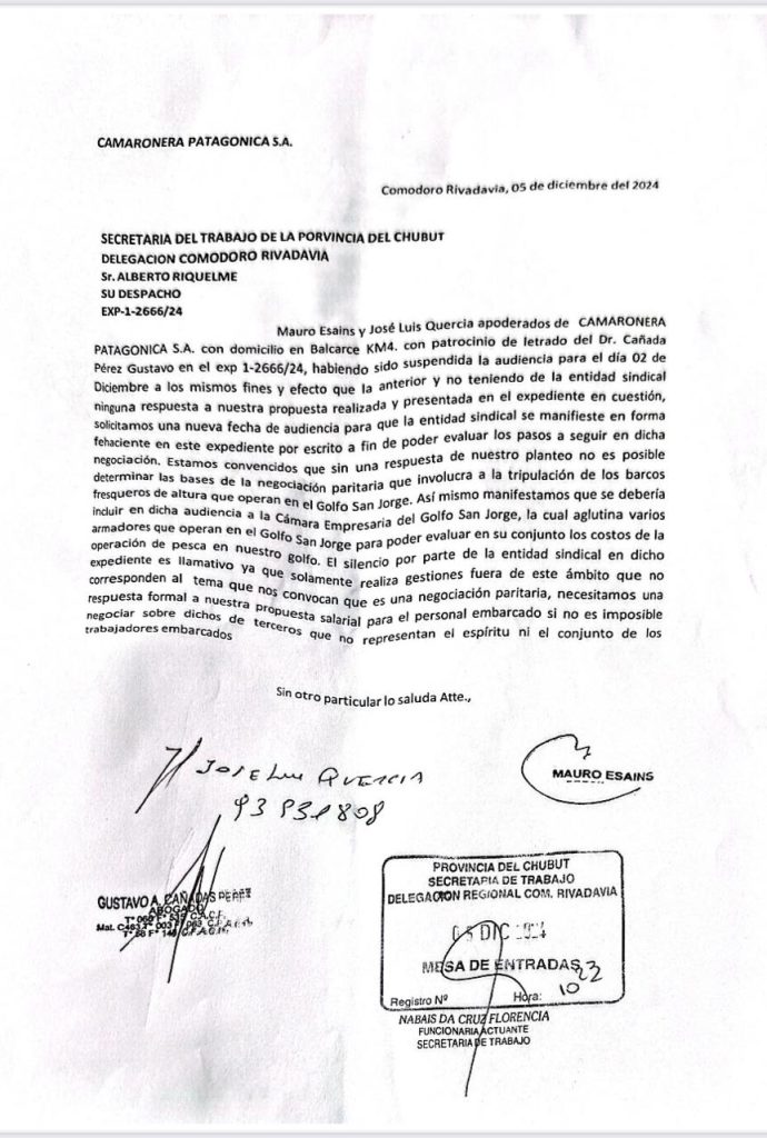 En su misiva, Camaronera Patagónica expresó que sin una respuesta formal por parte del sindicato es imposible establecer las bases para una negociación efectiva, que involucra a la tripulación de los barcos fresqueros. Además, reiteraron la necesidad de que se convoque a la Cámara Empresaria del Golfo San Jorge, que agrupa a varios armadores de la región, para evaluar de manera integral los costos de la operación pesquera en el golfo.