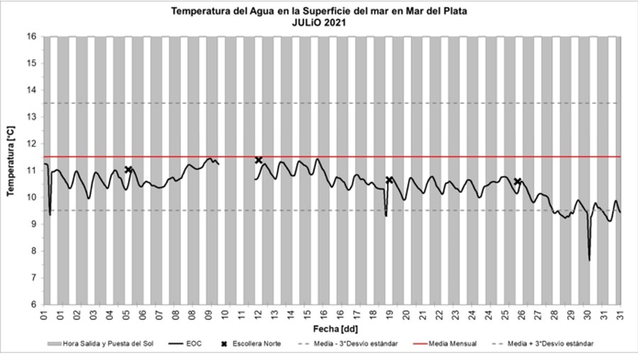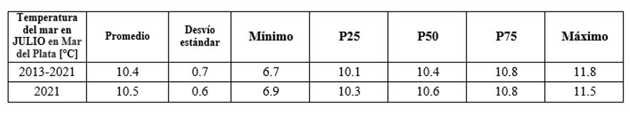 En definitiva, durante el mes de julio de 2021 la temperatura del mar en la superficie, en Mar del Plata, promedió los 10,5°C, con registros dentro de los límites mensuales considerados normales para la zona [9,5; 13,5] °C, pero siempre por debajo del valor medio mensual zonal (11,5°C). Con tendencia descendente los registros; entre los días 8 y 16 fueron superiores al 25% de los valores más altos (P75=10,8°C), y desde el día 27 la temperatura fue inferior al 25% de los registros más bajos (P25=10,1°C).