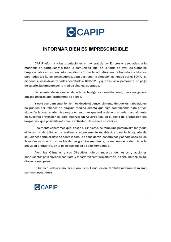 La Cámara Argentina Patagónica de Industrias Pesqueras (CAPIP) emitió un comunicado dirigido a las tripulaciones, la marinería y la comunidad en general, informando que este jueves las cámaras empresarias en su conjunto decidieron firmar la actualización de los salarios básicos para todas las flotas congeladoras, con el objetivo de destrabar el conflicto generado a partir de la medida de fuerza impulsada por el Sindicato de Obreros Marítimos Unidos (SOMU), que mantiene paralizada la actividad desde el pasado 6 de junio.
