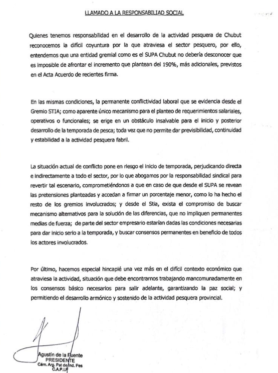 “Quienes tenemos responsabilidad en el desarrollo de la actividad pesquera de Chubut reconocemos la difícil coyuntura por la que atraviesa el sector pesquero, por ello, entendemos que una entidad gremial como es el SUPA Chubut no debería desconocer que es imposible de afrontar el incremento que plantean del 190%, más adicionales, previstos en el Acta Acuerdo de reciente firma.”