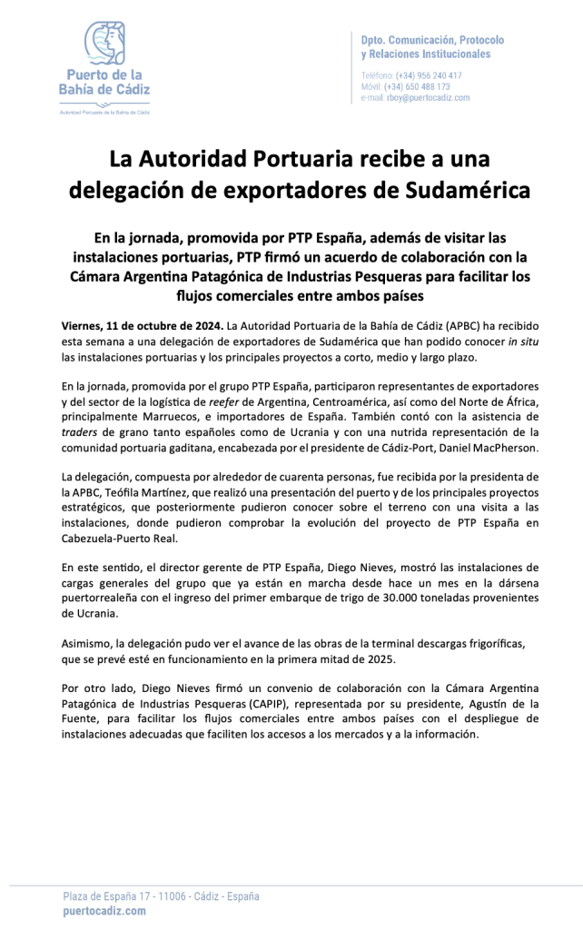 En el marco de una jornada impulsada por el grupo PTP España, se llevaron a cabo importantes actividades que reafirman la cooperación entre el sector portuario europeo y sudamericano. Durante el evento, que tuvo lugar esta semana en la Bahía de Cádiz, una delegación conformada por exportadores de Sudamérica impulsada por la CAPIP y otros actores clave del sector logístico pudo explorar de cerca las instalaciones portuarias y conocer los ambiciosos proyectos de la Autoridad Portuaria de la Bahía de Cádiz (APBC).