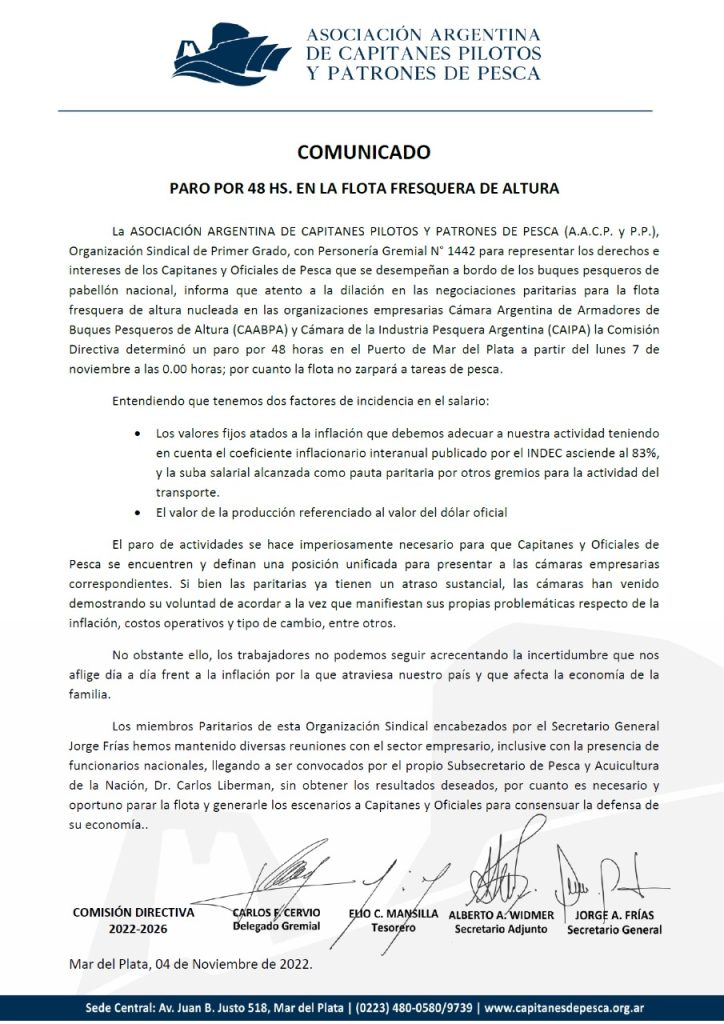 La Asociación indicó que atento a la dilación en las negociaciones paritarias para la flota fresquera de altura nucleada en las organizaciones empresarias Cámara Argentina de Armadores de Buques Pesqueros de Altura (CAABPA) y Cámara de la Industria Pesquera Argentina (CAIPA) la Comisión Directiva determinó un paro por 48 horas en el Puerto de Mar del Plata a partir del lunes 7 de noviembre a las 0.00 horas; por cuanto la flota no zarpará a tareas de pesca.