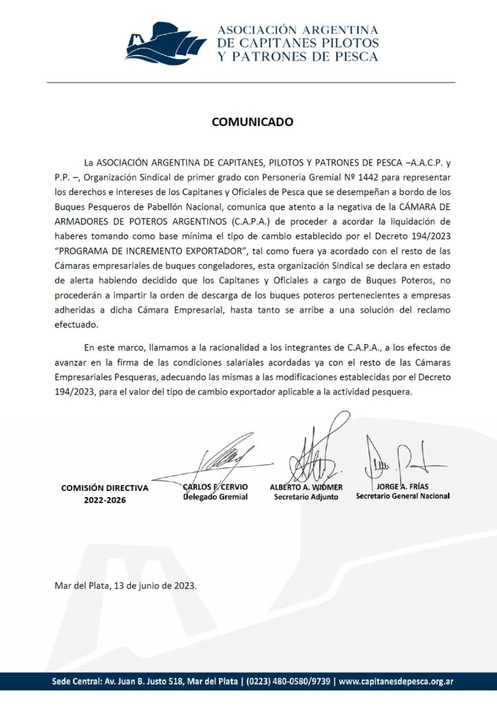 En una nota firmada por su secretario general Jorge Frías, Alberto Widmer (Secretario Adjunto) y Carlos Cervio (Delegado Gremial), comunicaron que atento a la negativa de la Cámara CAPA de proceder a acordar la liquidación de haberes, tomando como base mínima el tipo de cambio establecido por el Decreto 194/2023 “PROGRAMA DE INCREMENTO EXPORTADOR”, tal como fuera ya acordado con el resto de las Cámaras empresariales de buques congeladores, la organización sindical se ha declarado en estado de alerta habiendo decidido que los Capitanes y Oficiales a cargo de Buques Poteros, no procederán a impartir la orden de descarga de los buques poteros pertenecientes a empresas adheridas a dicha Cámara Empresarial, hasta tanto se arribe a una solución del reclamo efectuado.