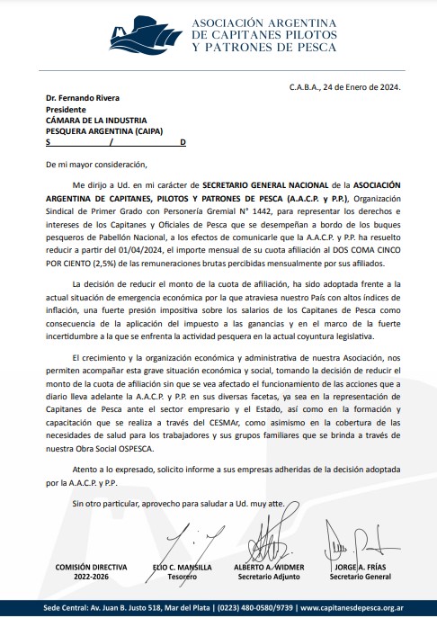 En este sentido la entidad que conduce el capitán de pesca Jorge Frías, informó que “ha resuelto reducir a partir del 01/04/2024, el importe mensual de su cuota afiliación al DOS COMA CINCO POR CIENTO (2,5%) de las remuneraciones brutas percibidas mensualmente por sus afiliados.”