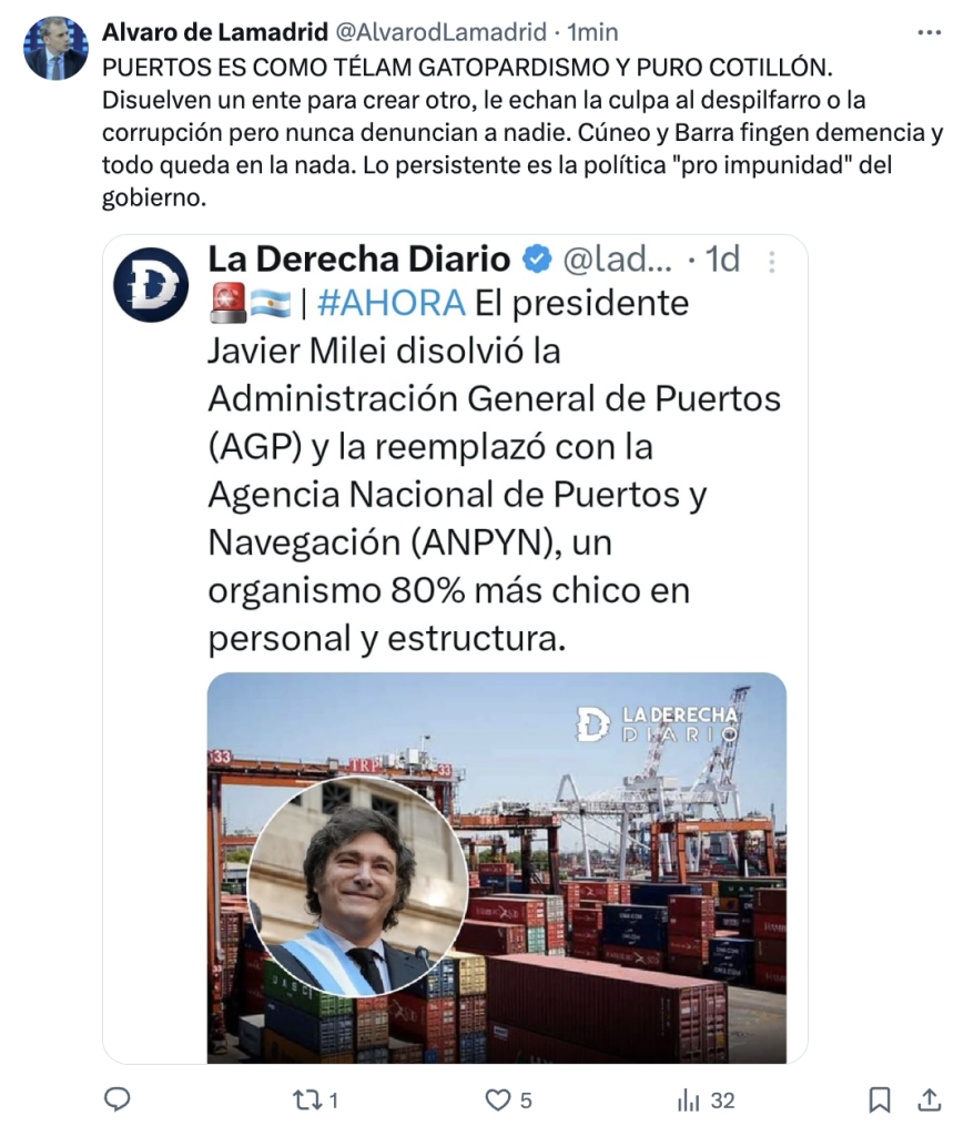 No obstante, no deja de llamar a la atención, las diferentes opciones esgrimidas según la postura partidaria de algunas posturas, que cerca de opiniones contrapuestas, se destacan, ocupando algunas críticas, como las esgrimidas por el ex diputado nacional y actual parlamentario del Mercosur, Dr. Alvaro de Lamadrid, quien en su cuenta X, posteó: