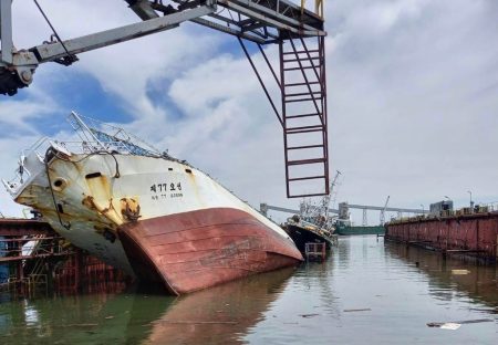 Avanzan las tareas sobre el malogrado BP Pescargen IV que zozobrara en el sitio 4 del muelle Storni en Puerto Madryn el pasado 5 de agosto. El buque recobra su estabilidad mientras lo sujeta la grúa Magnus VI.
