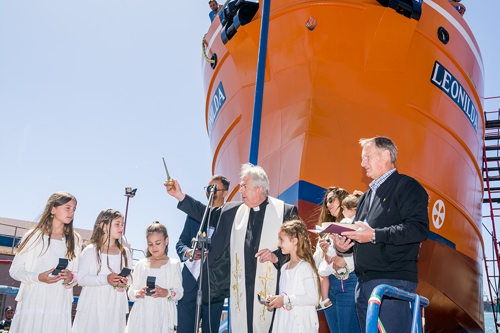 La ceremonia estuvo enmarcada por momentos de profundo simbolismo, como la participación de las cinco bisnietas de Leonilda Novelli de Contessi, quienes oficiaron como madrinas del buque, representando la continuidad generacional y el compromiso con los valores fundacionales de la empresa. La emotividad alcanzó su punto culminante con el bautismo del buque, oficiado por Monseñor Armando Ledesma, y el tradicional estallido de la botella de champagne contra el casco.