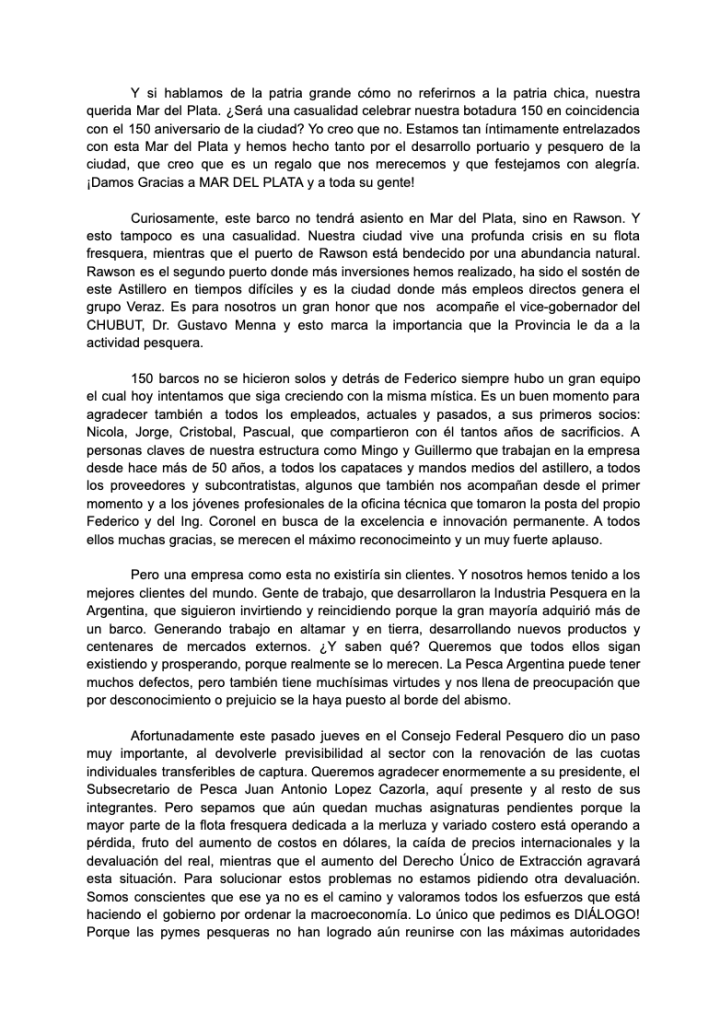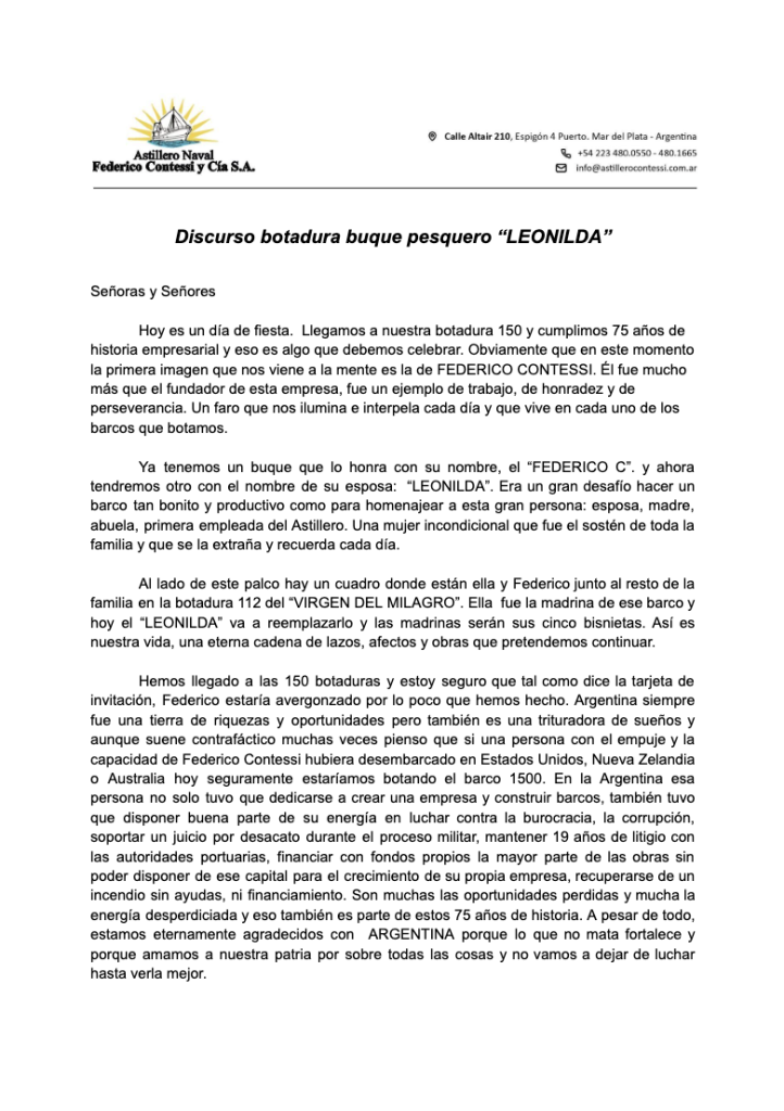 Durante la ceremonia, Domingo Contessi, presidente del astillero, brindó un emotivo discurso en el que recordó a su padre, Federico Contessi, y a su madre, Leonilda Novelli, destacando su papel fundamental en la fundación y crecimiento de la empresa. “Este buque lleva el nombre de una mujer que, con su trabajo y determinación, fue el sostén de nuestra familia y del astillero en los momentos más difíciles. Este es nuestro homenaje a su memoria y a su legado ”, afirmó Contessi ante la presencia multitudinaria de asistentes, entre los que se destacó en el palco de honor, la presencia del Subsecretario de Recursos Acuáticos y Pesca, Med Vet. Juan Antonio López Cazorla, entre otros.