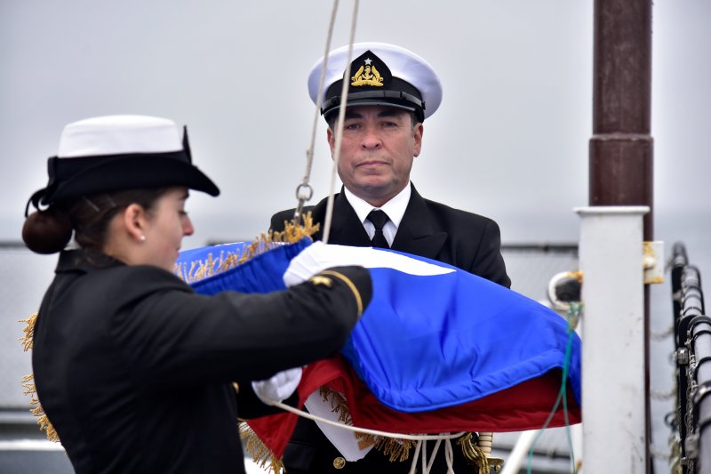 El Comandante en Jefe de la Armada, Almirante Juan Andrés De la Maza, explicó que la bandera de combate ondeará en momentos de crisis o conflicto, además de cinco ocasiones especiales y festivas cada año: el 21 de mayo, el 8 de octubre, el 18 y 19 de septiembre, y el día de aniversario del buque, el 3 de julio. Este acto marca la culminación de un proceso iniciado en 2017 con la construcción de este rompehielos. Tras el corte de la primera plancha de acero, el AGB-46 fue botado al agua el 22 de diciembre de 2022 y, finalmente, incorporado formalmente a la lista naval el pasado 3 de julio.