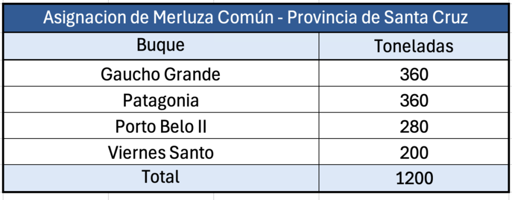 Para Santa Cruz, se asignó un volumen total de 1.200 toneladas de merluza común (Merluccius hubbsi), distribuidas de la siguiente manera: 360 toneladas para el BP Gaucho grande, 360 toneladas para el BP Patagonia, 280 toneladas para el BP Porto belo II y 200 toneladas para el BP Viernes santo. Estas asignaciones se descuentan del 4,80 % de la Captura Máxima Permisible (CMP) correspondiente a la provincia para 2026.