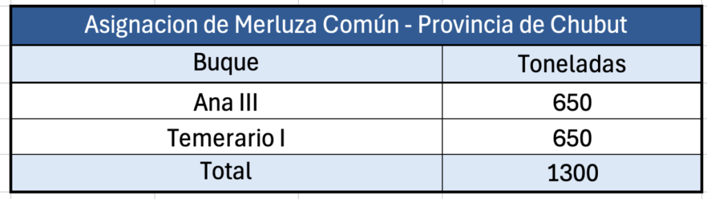En el caso de Chubut, el Consejo aprobó la asignación de 1.300 toneladas, con 650 toneladas destinadas al BP Ana III y otras 650 toneladas al BP Temerario I, imputadas al 4,8525 % de la CMP provincial fijada para el presente año.