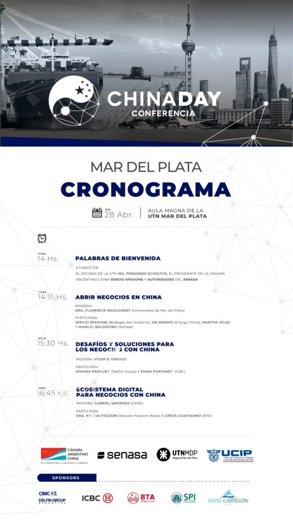 Detallando la actividad que se llevará a cabo el próximo viernes en Mar del Plata, Conconi destacó que “’los ChinaDay’ son eventos temáticos como ya hicimos en Rosario, buscando tenga que ver con el ‘ecosistema’ de negocios de cada lugar. En este caso, para Mar del Plata, lo hemos trabajando con el SENASA, y lo pensamos por excelencia por las pesqueras de Mar del Plata, Necochea, Bahía Blanca. Es decir, trabajamos en conjunto con el SENASA, la Cámara de Mar del Plata y la UTN que es quien nos brinda el lugar, pensando en hacer un evento que impacte, sobre todo porque es el mayor producto de exportación de la zona. Para eso tenemos tres paneles, entre lo que se contará como es abrir negocios a través de la Cámara, habrá especialistas en logística, creación de consorcios de exportación. Es algo así como el ‘360’ de pensar una exportación en todas sus dimensiones”.