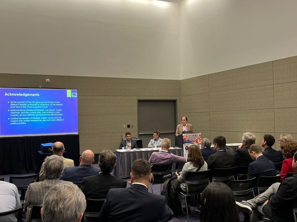 Los expositores Ernesto Godelman (CeDePesca), Federico Angeleri (Grupo Veraz) y Pablo Basso (Iberconsa Argentina) detallaron el extenso proceso de 10 años que demandó esta certificación, así como la importancia de este reconocimiento para la sostenibilidad del recurso y la sustentabilidad/competitividad del sector.