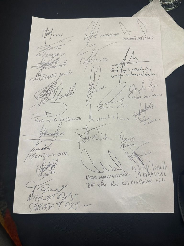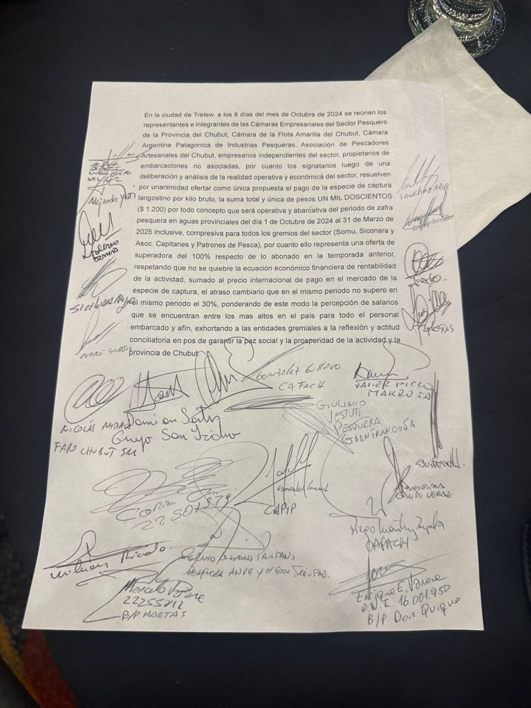 «En la ciudad de Trelew, a los 8 días del mes de octubre de 2024, se reúnen los representantes e integrantes de las Camaras Empresariales del Sector Pesquero de la Provincia de Chubut, Cámara de la Flota Amarilla del Chubut, Cámara Argentina Patagónica de Industrias Pesqueras, Asociación de Pescadores Artesanales del Chubut, empresarios independientes del sector, propietarios de embarcaciones no asociadas, por cuanto los signatarios luego de una deliberación y análisis de la realidad operativa y económica del sector, resuelven por unanimidad ofertar como única propuesta el pago de la especie de captura de langostino por kilo bruto, la suma total y única de un mil doscientos ($1200) por todo concepto que será operativa y abarcativa del periodo de zafra pesquera en aguas provinciales del día 1 de octubre de 2024 al 31 de marzo de 2025 inclusive, comprensiva para todos los gremios del sector (SOMU, SICONARA Y Asociación Capitanes y Patrones de Pesca) por cuanto ello representa una oferta superadora del 100% respecto de lo abonado en la temporada anterior, respetando que no se quiebre la ecuación económico financiera de rentabilidad de la actividad, sumado al precio internacional de pago en el mercado de la especie de captura, el atraso cambiado que en el mismo periodo no supero el 30%, ponderando de este modo la percepción de salarios que se encuentran entre los mas altos en el pais para todo el personal embarcado y afín, exhortando a las entidades gremiales a la reflexión y actitud conciliatoria en pos de garantizar la paz social y la prosperidad de la actividad y la provincia de Chubut.«