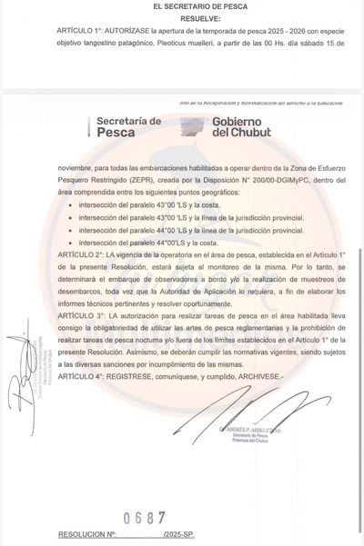 La decisi贸n qued贸 formalizada mediante la Resoluci贸n 0687/2025-SP, firmada por el secretario de Pesca, Andr茅s Arbeletche, quien autoriz贸 el inicio de la temporada para todas las embarcaciones habilitadas a operar dentro de la ZEPR. El sector abierto se corresponde con el 谩rea norte, delimitada por los puntos ubicados en la intersecci贸n del paralelo 43掳00鈥 LS con la costa y con la l铆nea de jurisdicci贸n provincial, y en la intersecci贸n del paralelo 44掳00鈥 LS tanto con la l铆nea jurisdiccional como con la costa. Se trata de un rect谩ngulo mar铆timo hist贸ricamente productivo durante las primeras semanas de actividad.