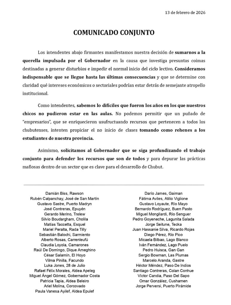 El comunicado aparece firmado por intendentes de múltiples localidades, entre ellas Rawson, Trelew y Puerto Madryn, y funciona como una señal de alineamiento territorial en torno a un mismo objetivo, que la investigación determine responsables, móviles e intereses, y que el ciclo lectivo 2026 no quede rehén de presiones o maniobras ilegítimas.