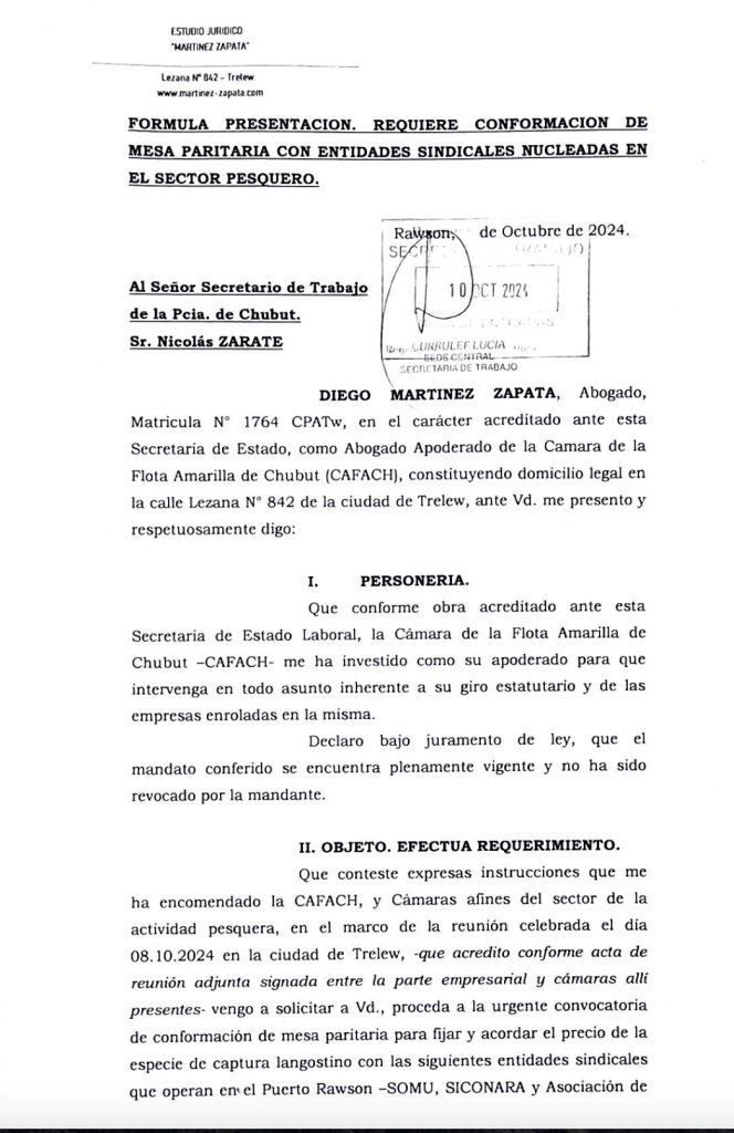 Mediante nota presentada el 10 de octubre, el Dr. Diego Martínez Zapata, matriculado bajo el Nro. 1764 en el Colegio Público de Abogados de Trelew, en calidad de apoderado de la Cámara de Armadores de la Flota Amarilla de Chubut (CAFACh), presentó una solicitud ante la Secretaría de Estado Laboral. En dicha presentación, haciendo atributos al ejercicio de su mandato, manifiesta que la CAFACh le ha conferido poder para intervenir en todos los asuntos relacionados con sus actividades y empresas afiliadas, garantizando que su mandato permanece vigente.