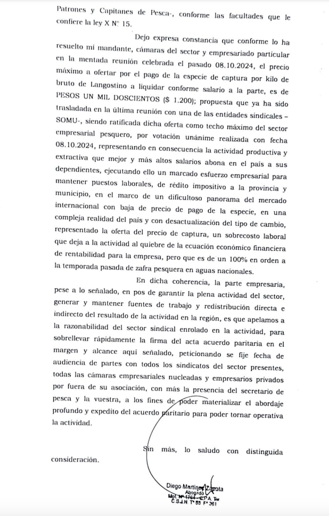 En tal sentido, el objeto de su petición consiste en requerir la urgente conformación de una mesa paritaria para acordar el precio de la captura del langostino, en conjunto con las entidades sindicales que operan la flota pesquera de Chubut: SOMU, SICONARA y la Asociación de Patrones y Capitanes de Pesca. Esta solicitud responde a las instrucciones impartidas por la CAFACh y cámaras del sector pesquero durante una reunión realizada el 8 de octubre de 2024, cuyo acta se adjuntó a la petición. Durante dicho encuentro, se estableció que el precio máximo por kilo de langostino bruto sería de $1.200, oferta que fue presentada previamente a SOMU y ratificada unánimemente por el sector empresarial como el tope máximo a ofrecer para la totalidad de la zafra 2024/2025. Dejando en claro el sector gremial que antes de discutir precios, es oportuno efectivizar el pago adeudado hasta la fecha.