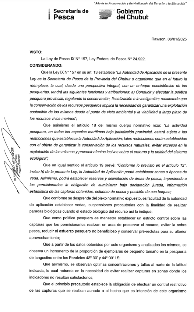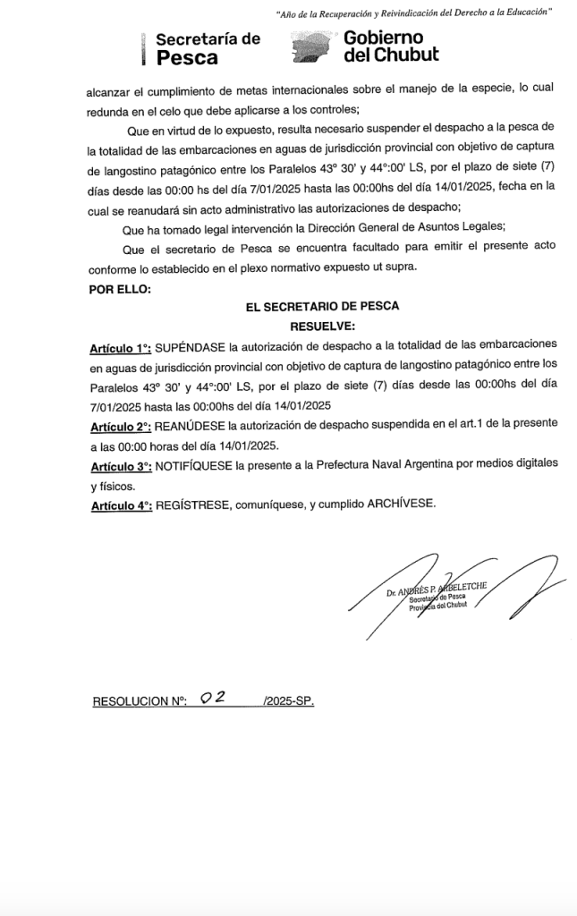 En coherencia con la destacada política pesquera provincial llevada adelante por el propio Secretario de Pesca de Chubut, Dr. Andrés P.Arbeletche, que busca preservar el recurso, evitar la sobrepesca, reducir esfuerzos pesqueros no beneficiosos y proteger pre-reclutas para su aprovechamiento futuro, ha dispuesto la SUSPENSIÓN precautoria del despacho a la pesca de la totalidad de las embarcaciones destinadas a la captura de langostino patagónico en aguas de jurisdicción provincial entre los Paralelos 43º 30’ y 44º 00’ LS. Esta medida regirá por el plazo de siete (7) días, desde las 00:00 horas del día 7 de enero de 2025 hasta las 00:00 horas del día 14 de enero de 2025, momento en el cual se reanudarán automáticamente las autorizaciones de despacho sin necesidad de acto administrativo adicional, según consta en la Resolución de la Secretaria de Pesca de Chubut Nro.2/2025 (ver al pie de la nota).