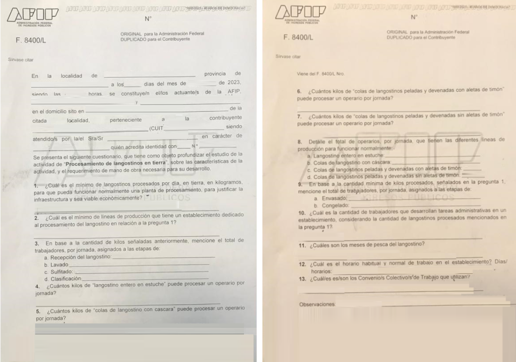 Por ejemplo, haber ingresado a un establecimiento procesador de 10 empleados y en el día procesar 15 toneladas finales del marisco, cuando la compra o el ingreso a planta fue declarado por 16 tn. Algo totalmente incongruente, inexacto e inconsistente que tanto AFIP, ADUANA y Ministerio de Trabajo, Empleo y Seguridad Social están trabajando par regularizar. Este cuestionario en calidad de declaración jurada FORM-8400/L viene a levantar información que a posterior se analizará para parametrizar ratios de entero/procesado pelado devenado, descartes, pesos, cantidad de mano de obra empleada, ratio kg.procesado/hora, cantidad de personal en función de tiempos, volúmenes, compras y exportaciones; valores que son importantes a la hora de saber si es posible con determinada cantidad de operarios procesar la cantidad informada y exportada.