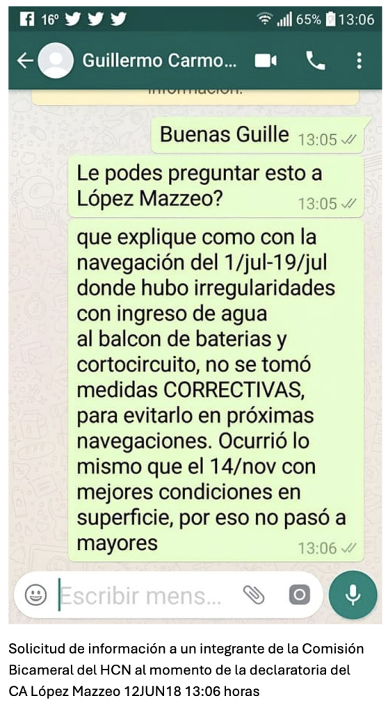 De acuerdo con la acusación, López Mazzeo habría autorizado la misión pese a conocer el estado técnico del submarino. En el caso de Villamide, se le atribuye haber recibido un informe que detallaba 47 desperfectos y no haber dispuesto que la navegación continuara en superficie tras el incendio en las baterías. Alonso está señalado por no garantizar el cumplimiento de las normas de alistamiento técnico, mientras que Correa habría restado relevancia al primer mensaje satelital que alertó sobre un principio de incendio a bordo más las presuntas e innumerables llamadas no respondidas según registros de Iridium satelital.