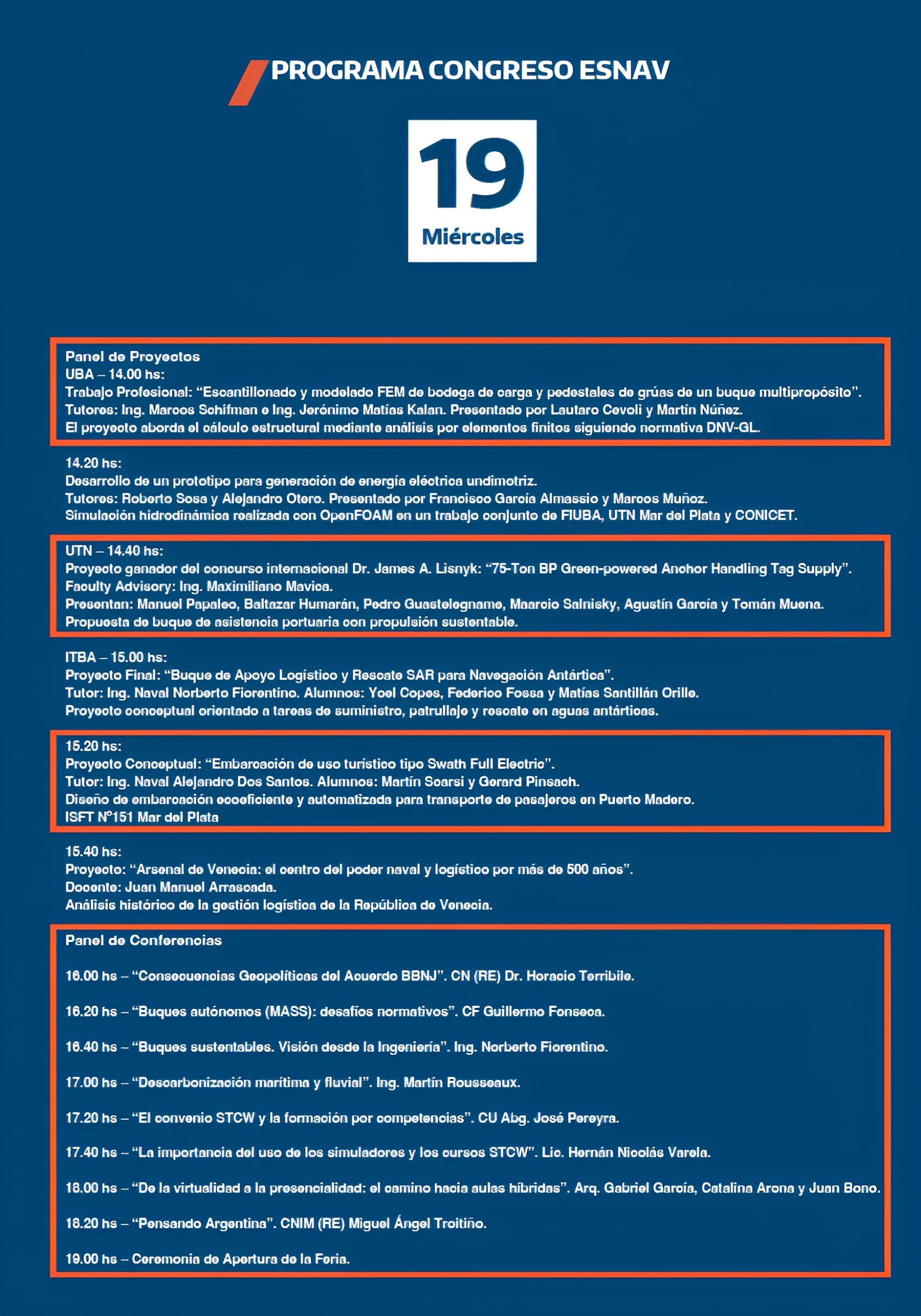 El programa del primer día comenzará con la presentación de proyectos académicos provenientes de universidades e institutos técnicos del país. Las exposiciones abarcan desde cálculos estructurales mediante análisis por elementos finitos y desarrollos de energías undimotrices, hasta diseños conceptuales de embarcaciones sustentables, buques de asistencia portuaria de nueva generación y propuestas logísticas de inspiración histórica.