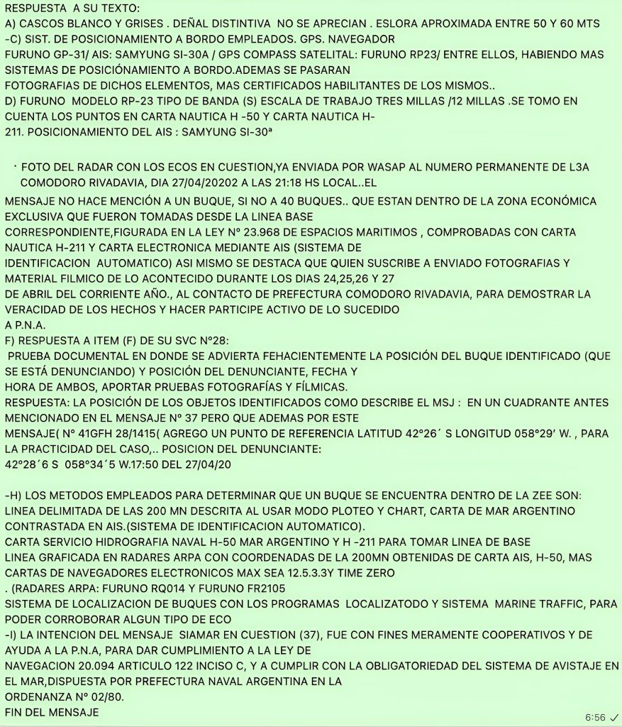 Uno de los m谩s de 50 mensajes enviados y recibidos por un Capit谩n de Pesca que cumpli贸 con el deber ciudadano de proteger la milla 200. El material in茅dito es parte de todos los mensajes recibidos en permanente contacto con PESCARE, desde el d铆a 23 de abril de 2020, cuando se dio origen a la posterior captura de los buques Lu Rong Yuan Yu 668 y Hong Pu 16 (ambos poteros de bandera china), por parte de la Prefectura Naval Argentina, con un despliegue de la Central de Tr谩fico Mar铆timo a las 贸rdenes del Prefecto Mayor N茅stor Kiferling, (actualmente Director de Tr谩fico Mar铆timo y recientemente ascendido a Prefecto General), bajo la direcci贸n del Prefecto General Carlos Villarreal (actualmente Director General de la PNA y Nro.3 en la sucesi贸n de mandos de la fuerza).