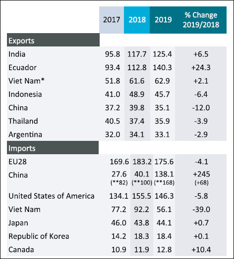 En el cuadro, elaborado por la FAO con datos del primer trimestre 2019, nuestro pa铆s figura como el s茅ptimo exportador en importancia a escala global detr谩s de India, Ecuador, Vietnam, Indonesia, China y Tailandia, aunque con una ca铆da interanual del 2,9 por ciento.