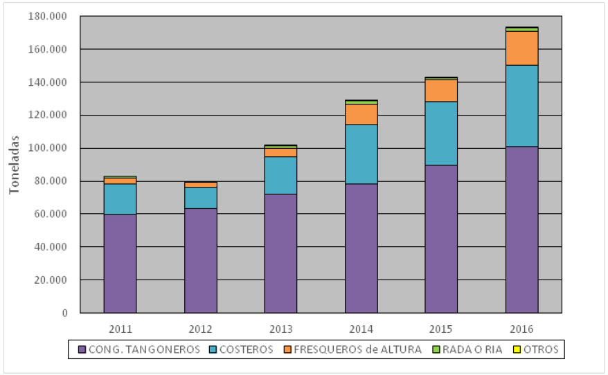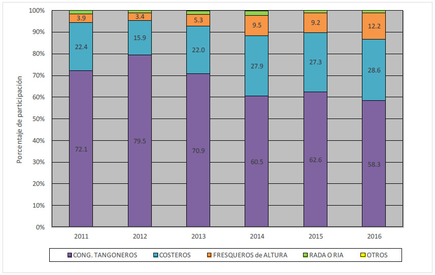 Se advierte una participación creciente de los buques costeros y fresqueros de altura, aunque la mayor porción sigue siendo de los congeladores.