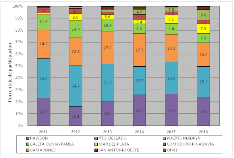Aquí se visualiza una distribución menos concentrada del recurso. Incluso, Mar del Plata, alejada de las zonas de pesca, pasó a tener casi el 8 por ciento de los desembarques, cuando entre 2012 y 2015 promedió los 5 puntos porcentuales.