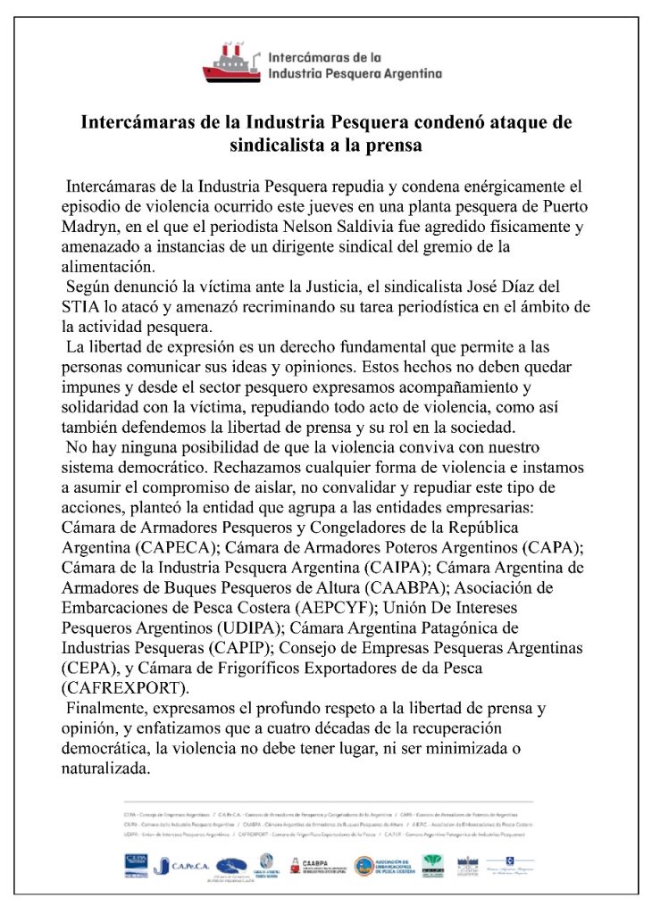 La Intercámara de la Industria Pesquera repudia y condena enérgicamente la agresión y amenaza sufrida por el periodista Nelson Saldivia en una planta pesquera de Puerto Madryn, a instancias del sindicalista José Díaz del STIA.