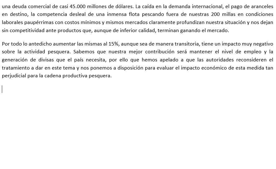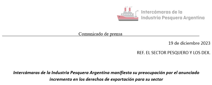 Al promediar la mañana emitieron el presente comunicado conjunto, integrado por la Cámara de Armadores Pesqueros y Congeladores (CAPeCA), Cámara de Armadores Poteros Argentinos (CAPA), Cámara de la Industria Pesquera Argentina (CAIPA), Cámara de Armadores de Buques Pesqueros de Altura, (CAAPBA), la Asociación de Embarcaciones de Pesca Costera y Fresquera (AEPCyF), la Unión de Intereses Pesqueros Argentinos (UDIPA), la Cámara Patagónica de Industrias Pesqueras (CAPIP) y el Consejo de Empresas Pesqueras Argentinas (CEPA), todas, coincidieron en que la medida, aunque fuera transitoria, tendría “un impacto muy negativo sobre la actividad pesquera”.