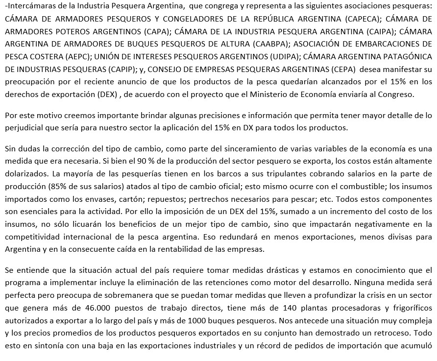 Agregaron, “la imposición de un DEX del 15%, sumado a un incremento del costo de los insumos, no sólo licuará los beneficios de un mejor tipo de cambio, sino que impactarán negativamente en la competitividad internacional de la pesca argentina ”.