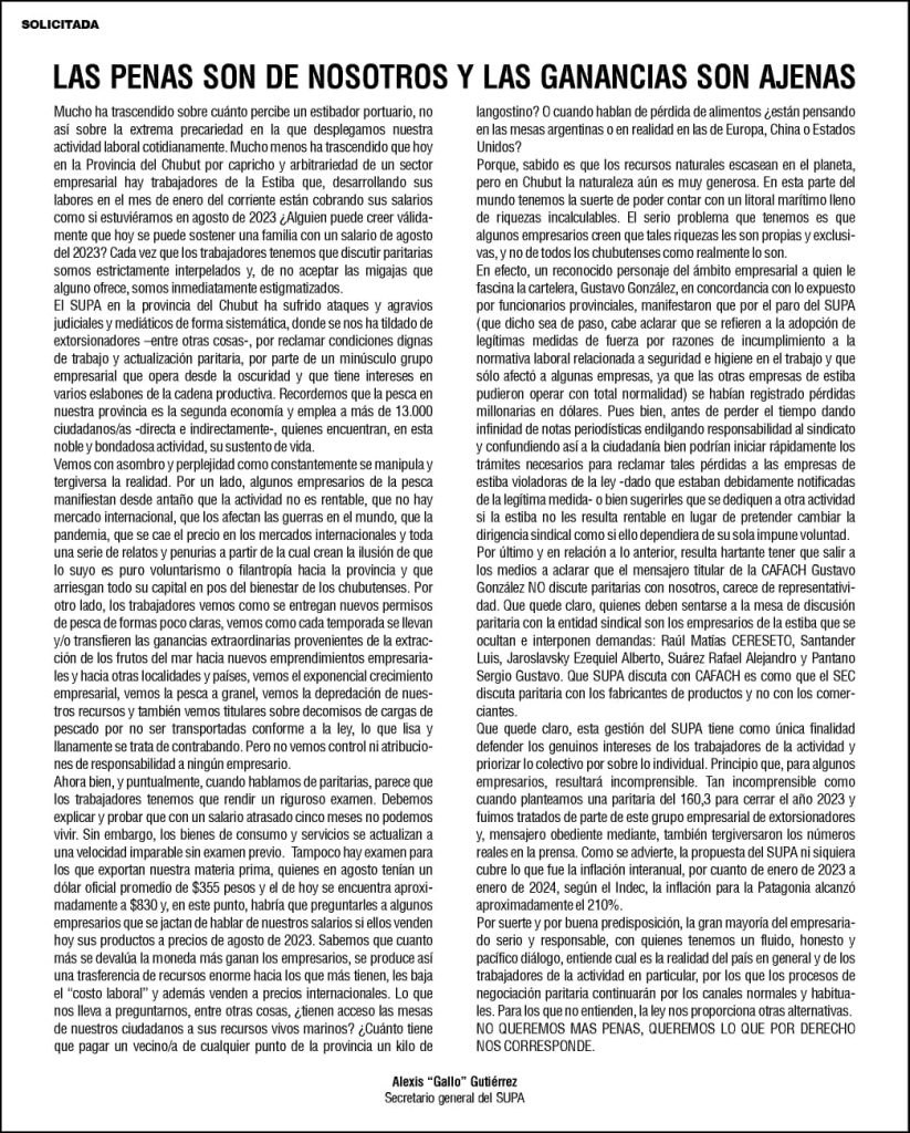 “El SUPA en la provincia del Chubut ha sufrido ataques y agravios judiciales y mediáticos de forma sistemática, donde se nos ha tildado de extorsionadores –entre otras cosas-, por reclamar condiciones dignas de trabajo y actualización paritaria, por parte de un minúsculo grupo empresarial que opera desde la oscuridad y que tiene intereses en varios eslabones de la cadena productiva. Recordemos que la pesca en nuestra provincia es la segunda economía y emplea a más de 13.000 ciudadanos/as -directa e indirectamente-, quienes encuentran, en esta noble y bondadosa actividad, su sustento de vida”, relata el gremio mostrando su visión de lo que está aconteciendo en Chubut con respecto al gremio de la estiba.