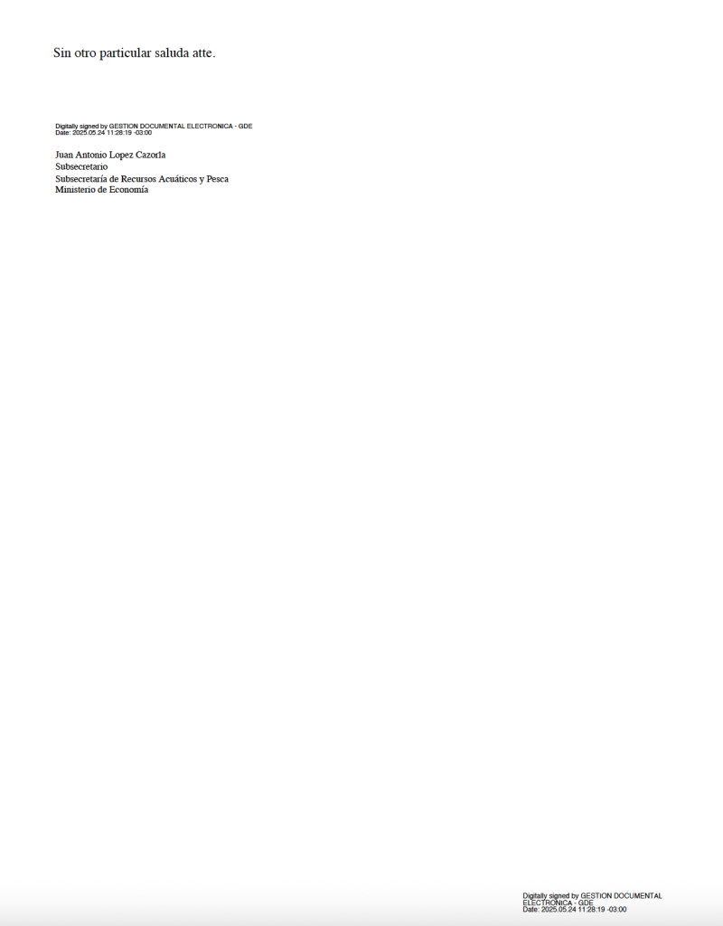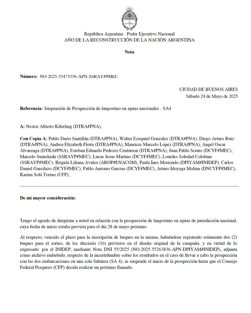 El Ministerio de Economía, a través de la Subsecretaría de Recursos Acuáticos y Pesca, confirmó este sábado 24 de mayo la suspensión de la prospección de langostino (Pleoticus muelleri) prevista para el próximo 28 de mayo en aguas de jurisdicción nacional, dentro de la Zona de Veda Permanente de Juveniles de Merluza (ZVPJM). La medida fue oficializada mediante la Nota NO-2025-55475556-APN-SSRAYP#MEC firmada por el Subsecretario de Recursos Acuáticos y Pesca, Juan Antonio López Cazorla., quien se lo vio visiblemente consustanciado y trabajando arduamente por impulsar el inicio de una zafra, que por el momento no llegó.