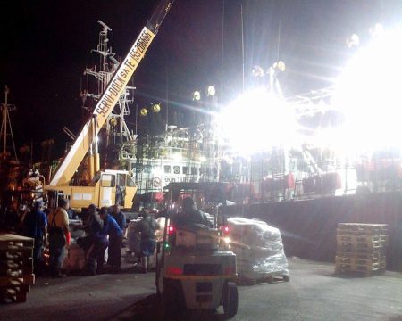 La recuperación del servicio de carga permitió en los últimos dos meses intensificar el ingreso de buques poteros, agilizando los envÃos del calamar al exterior; pero aún en ese marco siguió siendo bajo el volumen general operado. El barco cargaba entre sesenta y setenta contenedores.