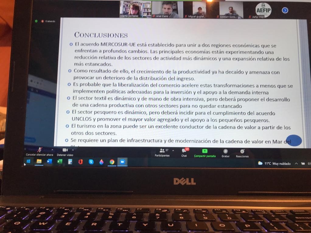 Mientras tanto, la Lic. Marita González, con vasta experiencia en la relaciones internacionales, comercio y como representante de la CGT en el MERCOSUR, hizo una presentación enfocada en las negociaciones Unión Europea – MERCOSUR en una línea de tiempos desde 1995 a la actualidad.