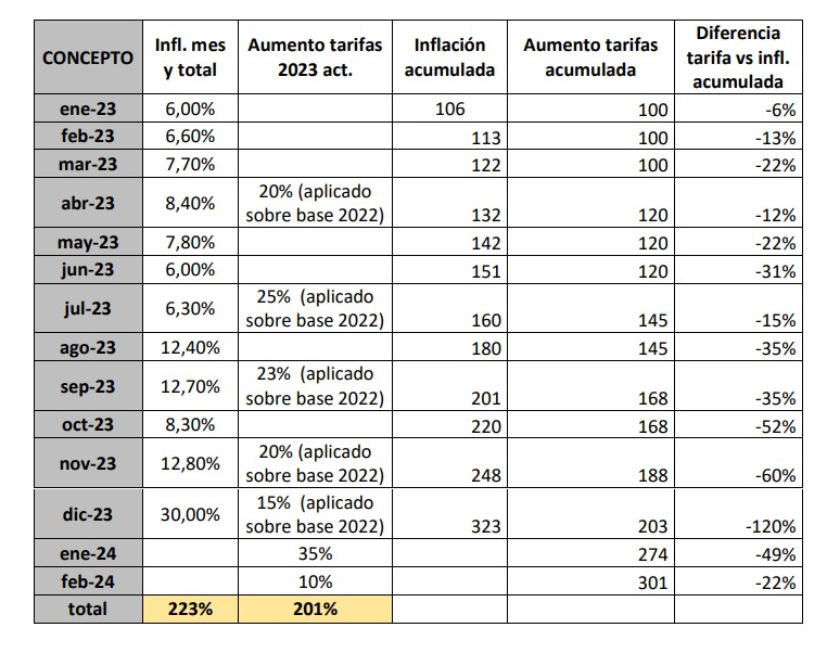 La actualización que fue propuesta es del 35 % aplicable sobre los cánones fijados en pesos, consolidando así el cuadro tarifario en esa moneda correspondiente al ejercicio presupuestario 2023 con una variación acumulada del 174 %, “el que servirá de base para las proyecciones de recursos para el próximo año”, sostiene.