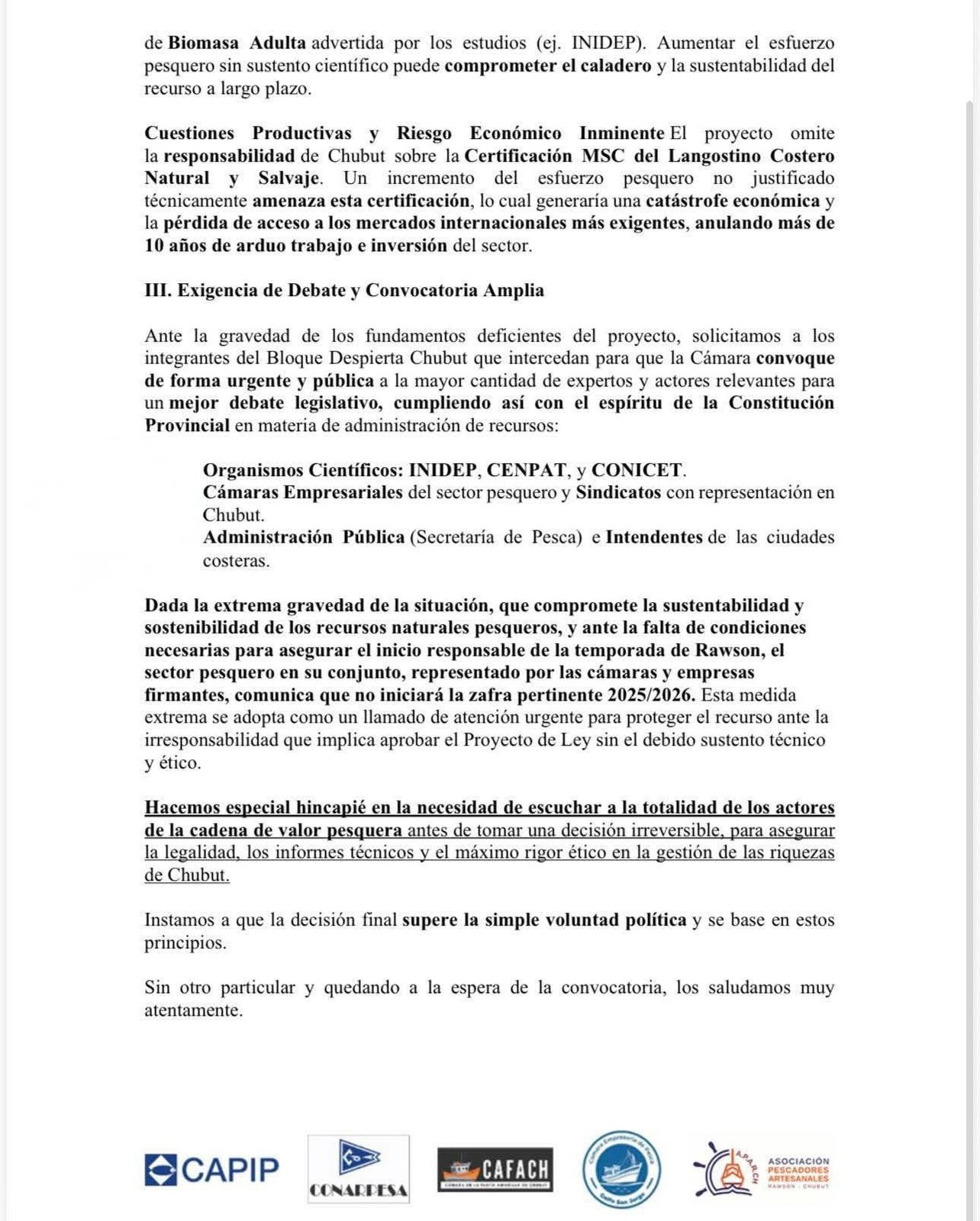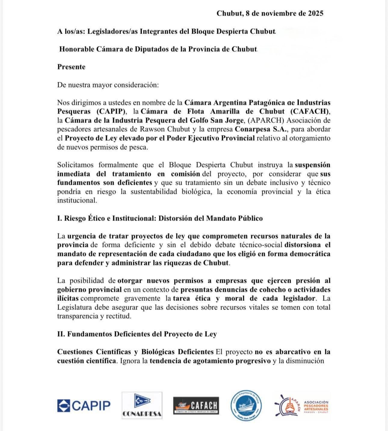 La decisión fue comunicada tras una nueva presentación formal ante la Legislatura provincial por parte de la Cámara Argentina Patagónica de Industrias Pesqueras (CAPIP), la Cámara de la Flota Amarilla de Chubut (CAFACh), la Asociación Pescadores Artesanales Rawson Chubut (APARCH) y la empresa Conarpesa S.A., que solicitaron la suspensión inmediata del tratamiento del proyecto en comisión.