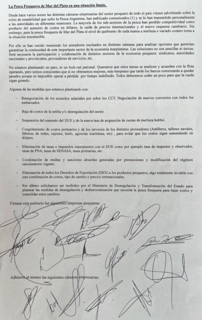 “Desde hace varios meses las distintas cámaras empresarias del sector pesquero de todo el país vienen advirtiendo sobre la crisis de rentabilidad que sufre la Pesca Argentina, han publicado comunicados (1) y se lo han transmitido personalmente a las autoridades en diferentes reuniones. La mayoría de los sub-sectores de la pesca han perdido competitividad como producto del aumento de costos en dólares, la caída de precios internacionales y el nuevo esquema cambiario. Sin embargo, para la pesca fresquera de Mar del Plata el nivel de quebranto de cada marea a merluza o variado costero torna a la situación insostenible.