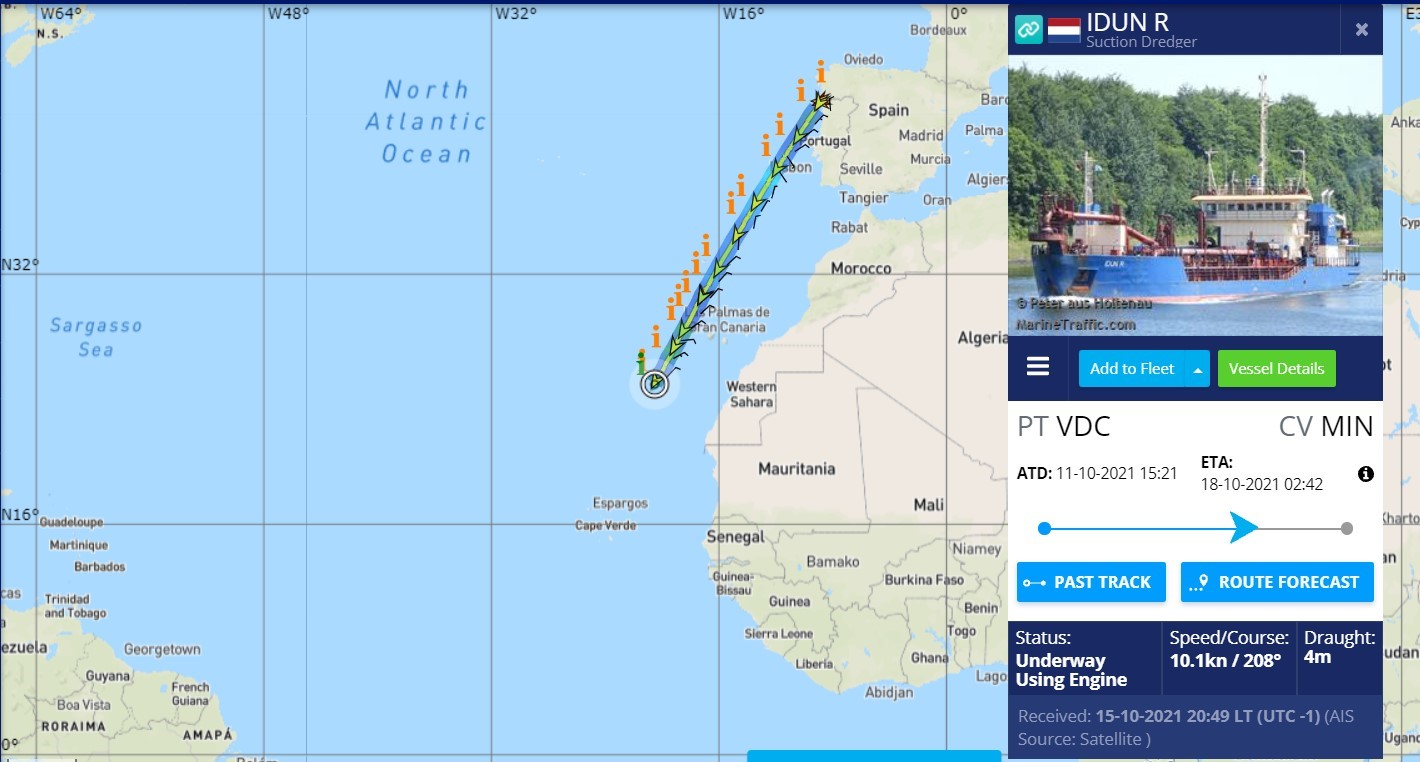 La Idun R, partió del puerto de Viana do Castelo, Portugal, por estas horas con rumbo SW, navega a 11 nudos con destino intermedio, el puerto de Mindelo en una de las Islas del conglomerado Cabo Verde, en medio del Atlántico y al Este de Senegal. El arribo estimado al puerto local será el próximo 3 de noviembre según lo confirmó el propio Presidente del CPRMDP a este portal, Gabriel Felizia.