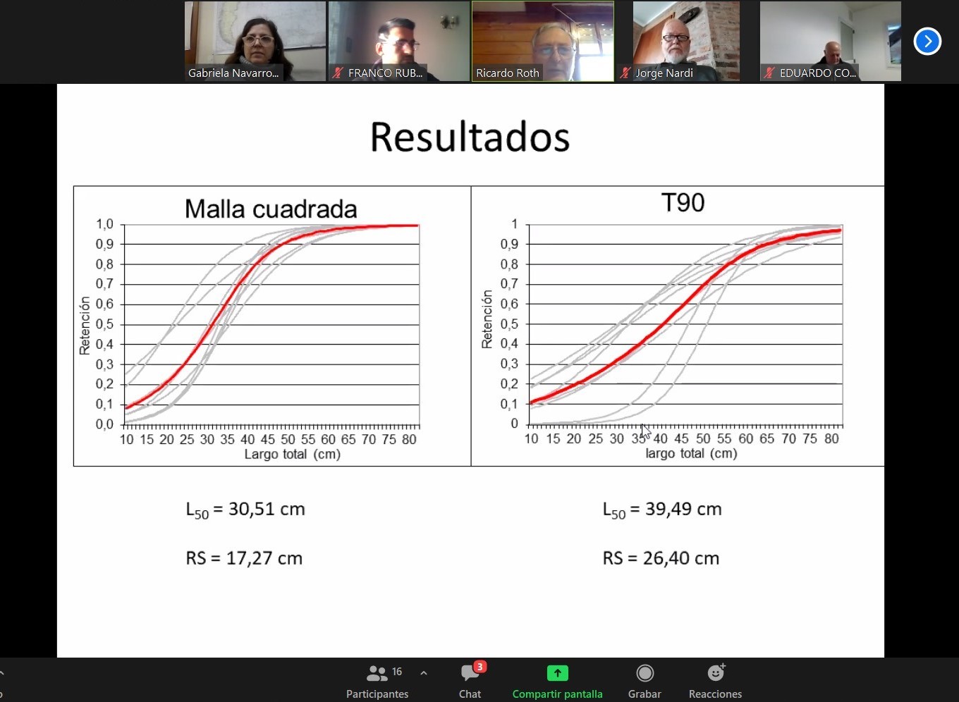 Con la participación del Capitán Luis Pérez Águila habiendo relatado la experiencia con dispositivos de selectividad de merluza de cola sobre juveniles de la misma especie, dejo aclarado que la campaña fue iniciada antes y en forma presurosa debido al vencimiento de la certificación de MSC hacia la empresa que trabaja, cuyo resultado fue exitoso en función de haber incorporado una malla de copo más clara, aunque destacó que desde la óptica comercial se debe seguir trabajando. Por parte del Instituto rector biológico, el responsable del área artes de pesca, Ing. Ricardo Roth presento los resultados insatisfactorios en cuanto a selectividad de rayas sobre recurso merluza, haciendo una demostración de curvas de selectividad sobre dispositivos comparativos de malla cuadrada y malla 90mm, que no tuvieron el resultado esperado, ya que sobre una retención del 50%, la talla capturada fue de 30.51cm y 39.49cm respectivamente.