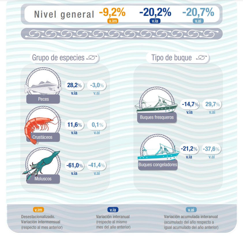 Vale recordar que el IPI pesquero es un indicador de coyuntura que tiene como principal objetivo medir la evolución mensual de la producción del sector pesquero. En este informe técnico, se presenta la actividad de pesca marítima desagregada por grupo de especies –peces, crustáceos y moluscos– y por tipo de buque –buques fresqueros y buques congeladores–.