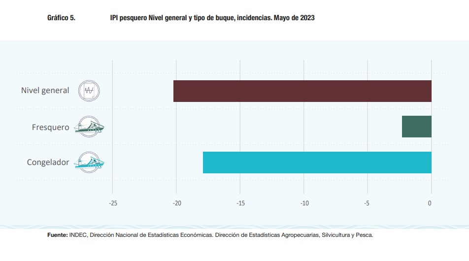 De acuerdo a la publicación, en mayo de 2023, el Índice de producción industrial pesquero (IPI pesquero) muestra una caída de 20,2% respecto a igual mes de 2022, mientras que el acumulado enero-mayo de 2023 presenta una disminución de 20,7% respecto a igual período del año anterior.