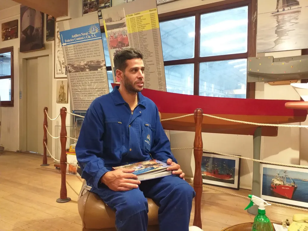 Haciendo un alto en sus tareas, nos recibe con su indumentaria de trabajo. Con sus 34 años de edad tiene diversas responsabilidades en un astillero que crece y que va buscando espacio e innovaciones en tecnología.