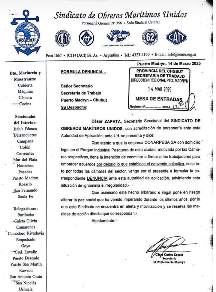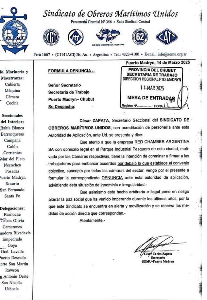 El Sindicato de Obreros Marítimos Unidos (SOMU) de Puerto Madryn, a través de su secretario César Carlos Zapata, ha denunciado formalmente a las empresas Red Chamber Argentina, Agropez S.A. y Conarpesa S.A., por presuntas irregularidades en la posibilidad de firmar acuerdos salariales con los trabajadores.