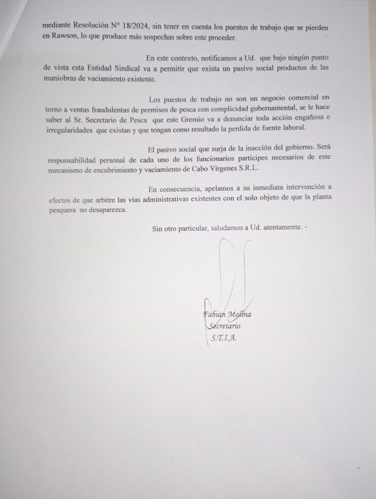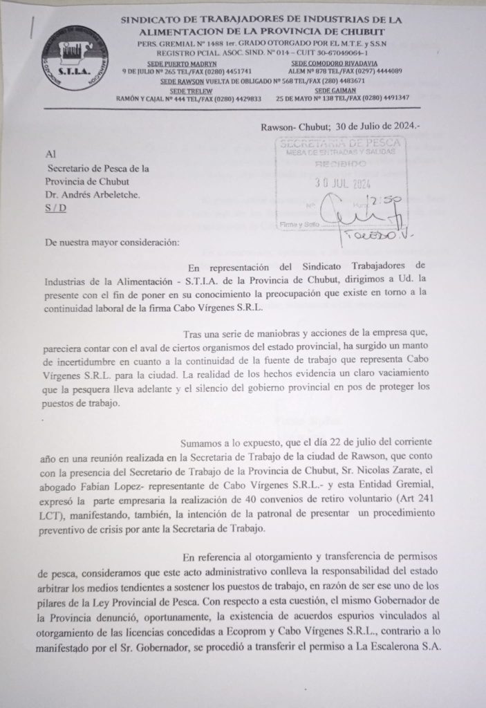 La organización sindical se ha dirigido al Secretario de Pesca de la Provincia, Andrés Arbeletche, para expresar su profunda preocupación por la continuidad laboral en la empresa y exigir acciones inmediatas para proteger los empleos.