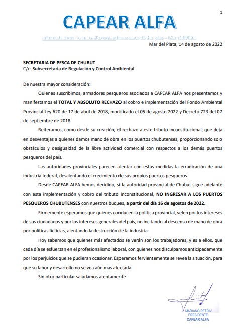En la misiva al Secretario de Pesca de Chubut, Dr. Jose Gabriel Aguilar, se desprende que de no deponer esa actitud, los armadores asociados a CAPEAR ALFA a partir de las 0hs de mañana martes 16 de agosto de 2022 decidieron con sus barcos, » NO INGRESAR A LOS PUERTOS PESQUEROS CHUBUTENSES» sic.