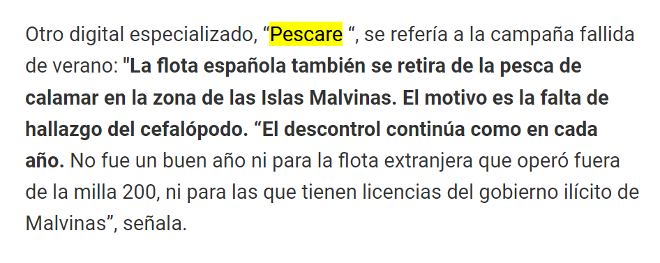 “Pero lo cierto es que los medios argentinos son cada vez más beligerantes y no pasan por alto que empresas mixtas de Vigo y Malvinas faenen dos veces al año en el caladero de las islas (denominadas Falkland por los británicos) en régimen de monopolio. Para la prensa argentina se trata de ‘piratería’ y así lo señalan reiteradamente, en especial tras la última campaña, que tuvo que finalizar antes de tiempo ante el descenso en picado de producto. La próxima será ya en febrero, aunque los barcos parten desde Vigo tras la fiesta de Reyes, para pasar dos o tres semanas antes en la zona”, destacaron respetando el nombre de “Malvinas” a nuestras islas.