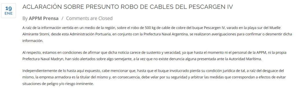 Los intereses creados –vaya uno a saber persiguiendo que fines- vertieron informaciones infundadas, donde “pour la galerie” se habló de robos y saqueos en la embarcación, puntualizados en que alguna/s personas se habrían llevado 500 kilos (puntualmente, de una dudosa exactitud) de cable de cobre del “Pescargen IV”.